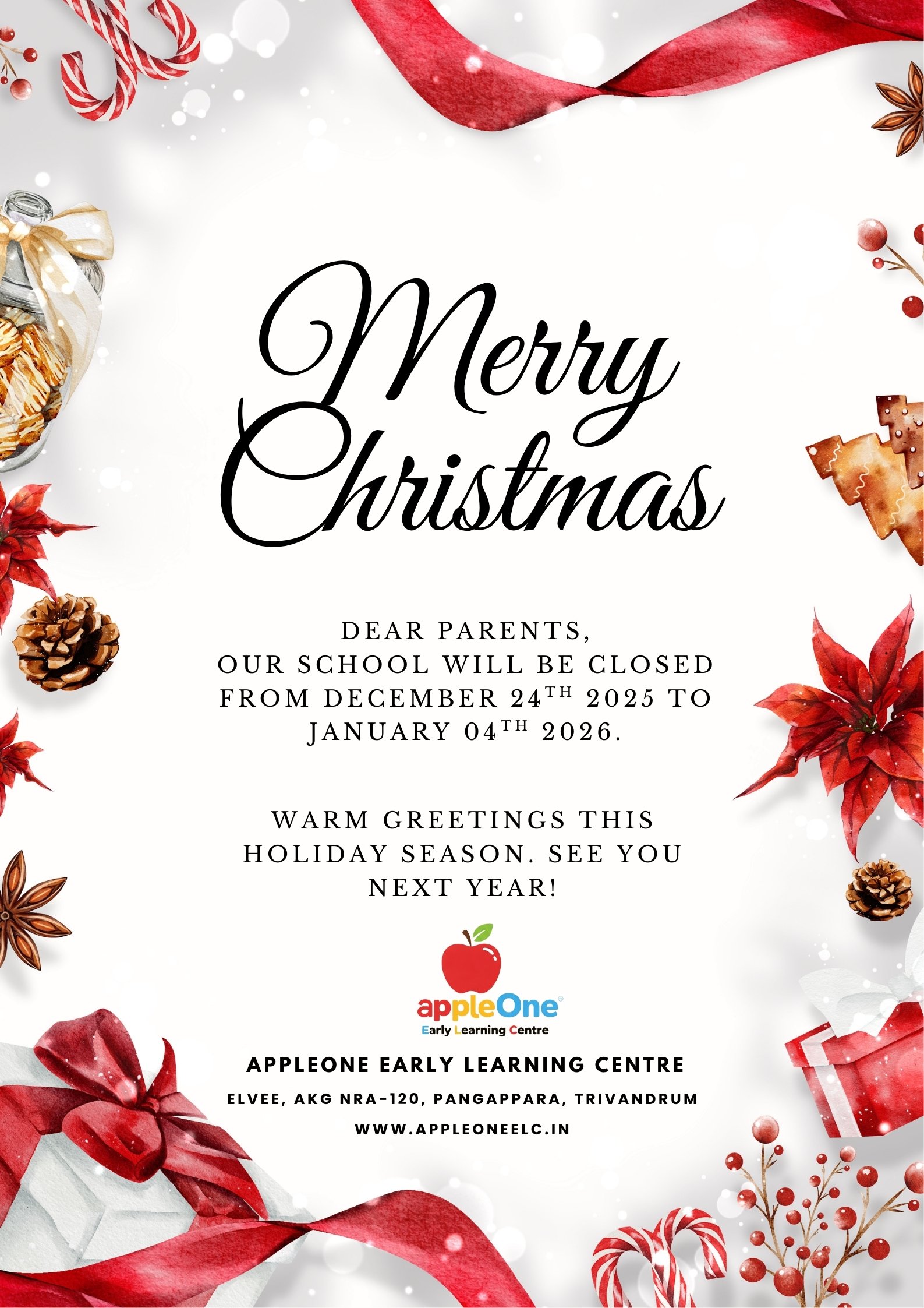 Dear Parents, Please be informed that the school will remain closed from 24th December 2025 to 4th January 2026 on account of Christmas and New Year holidays. The school will reopen on Monday, 5th January 2026. We wish all our parents and little ones a joyful Christmas and a Happy New Year filled with happiness and good health. Warm regards, AppleOne Early Learning Centre 🎄✨