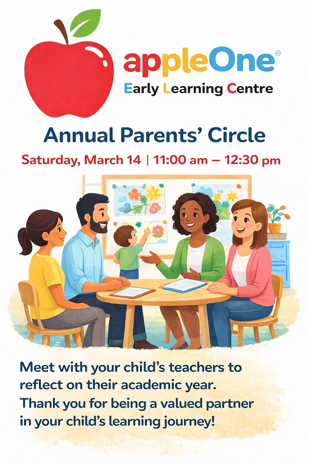 Dear Parents, We will be having our Annual Parents’ Circle on Saturday, March 14th, 2026, from 11:00 am to 12:30 pm. This meeting is an opportunity for you to interact with the teachers and understand how your child has spent the academic year at AppleOne, their experiences, learning, growth, and areas where we can continue to support them further. It is also a special moment for the school to thank all our parents for choosing AppleOne and for the trust you have placed in us throughout the year. We truly look forward to meeting you and sharing this time together.